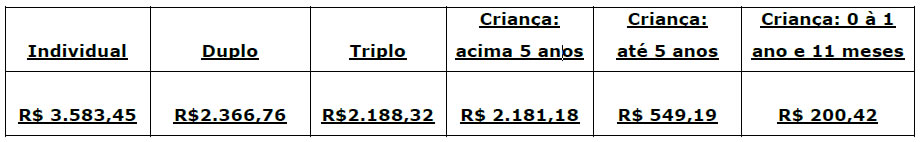 *Valor da criança válido somente quando acompanhada de dois adultos pagantes no mesmo apartamento.